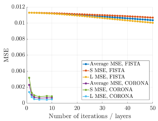 \[\mathcal{L}(\theta) = \frac{1}{2n} \sum_{i=1}^n{||f_S(D_i,\theta)-\hat{S}_i||_F^2} + \frac{1}{2n} \sum_{i=1}^n{||f_L(D_i,\theta)-\hat{L}_i||_F^2}.\]The unfolded deep neural network has a total of 1,796 parameters.