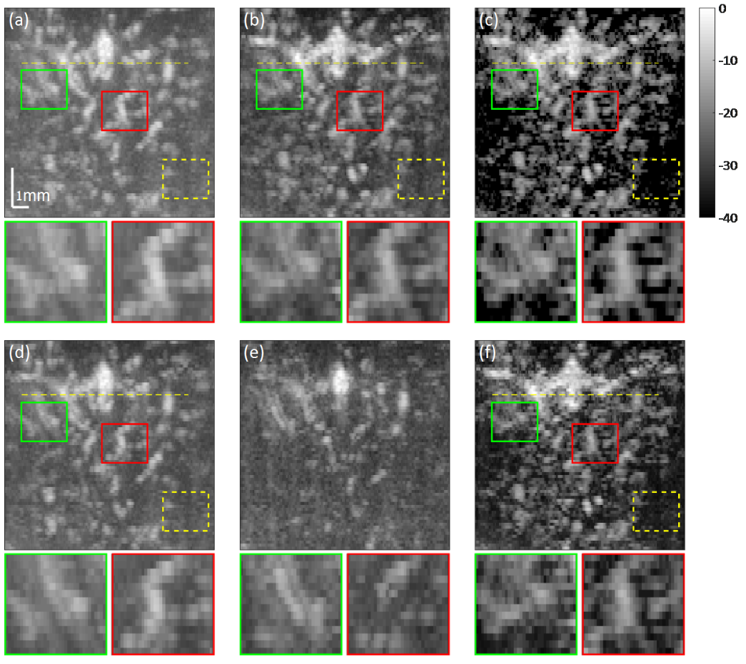 Rat data results. (a) SVD result. (b) Iterative result. (c) Unfolded result. (d) High-pass filter with high cut-off frequency. (e) High-pass filter with low cut-off frequency. (f) ResNet results.