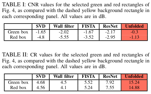 - Results on in vivo data: classic methods (high-pass filter, SVD) and proposed methods (iterative algorithm, unfolded, ResNet).
