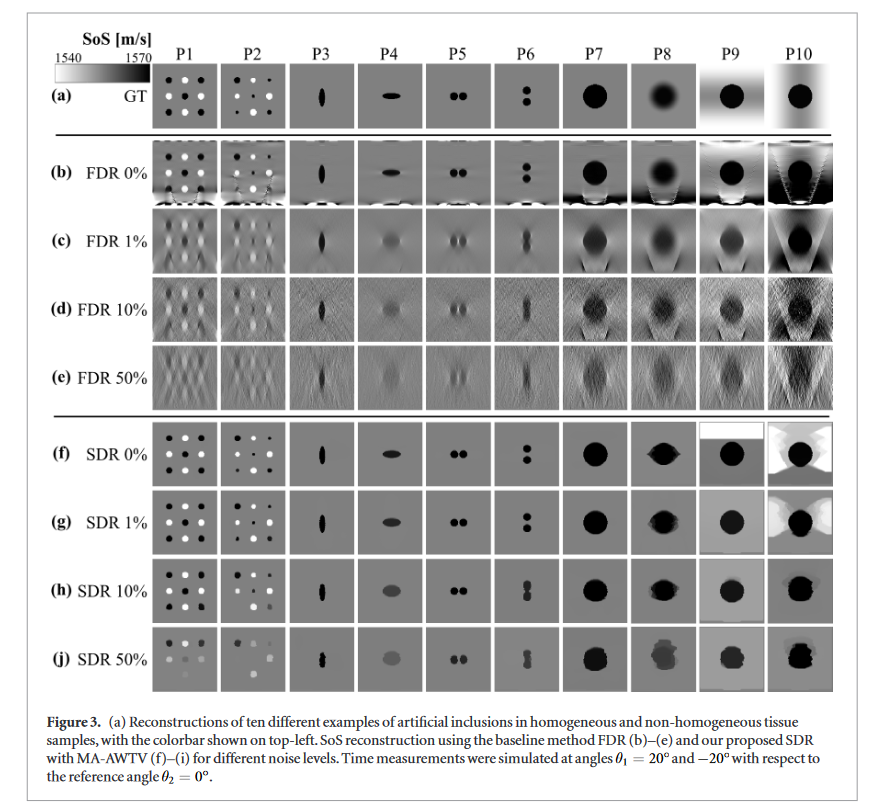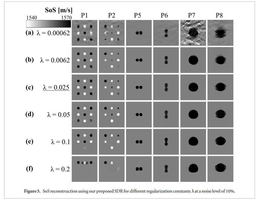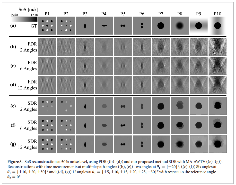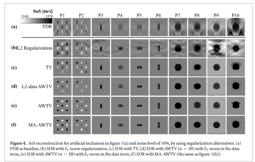 \[\hat{\sigma}_{\text{MA-AWTV}} = \arg\min_{\sigma} \|\boldsymbol{\tau} - \mathbf{L} \boldsymbol{\sigma} \|_1 + \lambda \sum_{i,j} \sum_{\alpha} \kappa_{\alpha} | D_{\alpha} \boldsymbol{\sigma} |,\]Bayesian approach : Incorporation of prior known data from B-mode imaging to reduce the number of degrees of freedom in the reconstruction of the inverse problem.