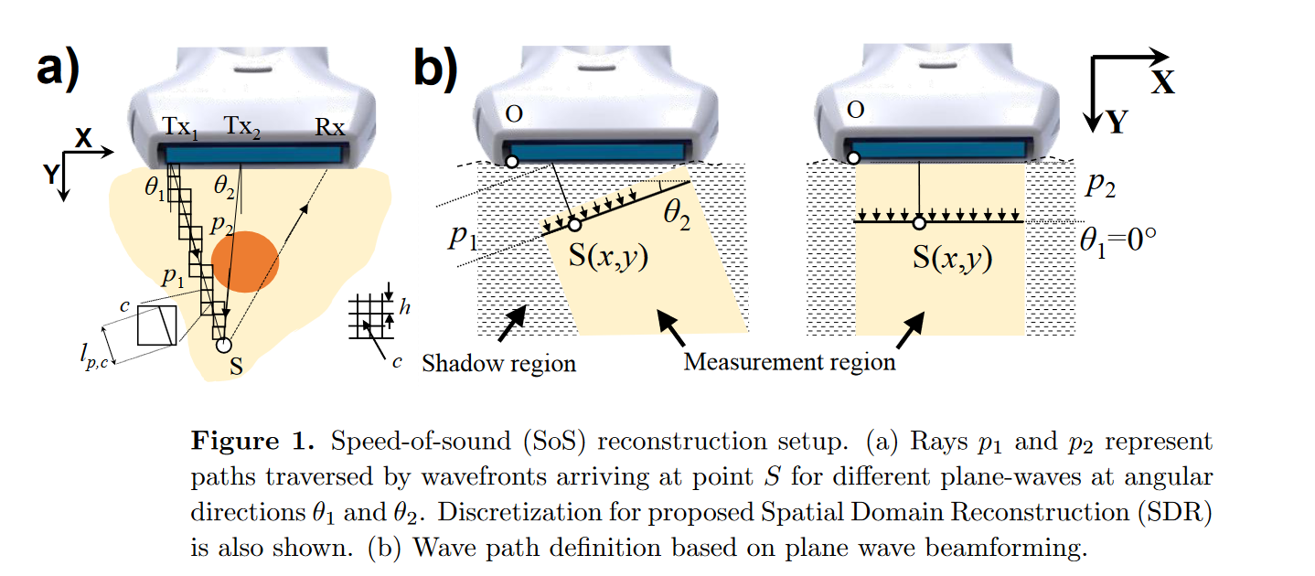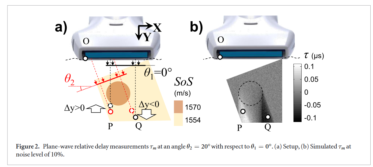 Considering straight ray approximation, the slowness can be directly linked to the differential time-of-flight based on apparent displacements along different ultrasound wave propagation paths when changing the steering angle.