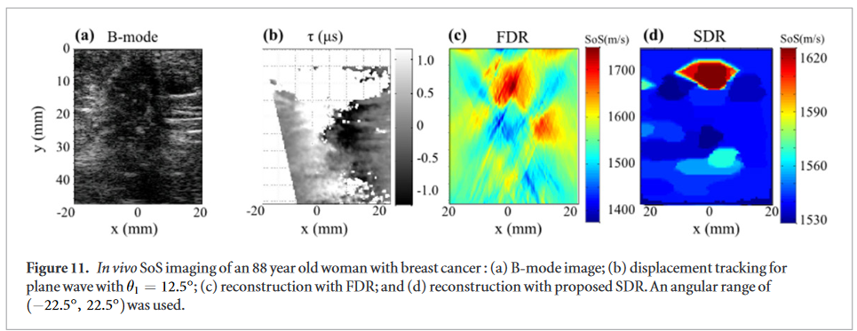 SDR algorithm delineates an inclusion geometry at (x = 0, y = 10) above the mid-range SoS value (1580 m/s), as a single focal region as confirmed by biopsy and with a lateral extent in agreement with that observed in B-mode.