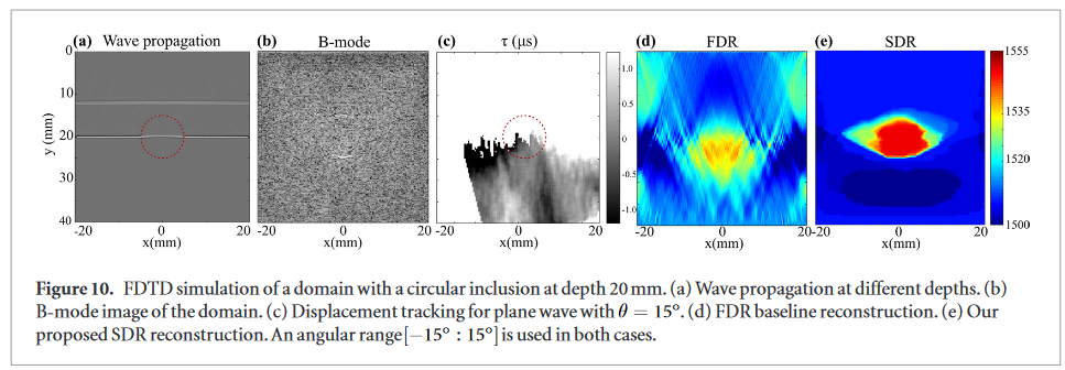 As a more realistic simulation,they performed numerical simulations of wave propagation. A tissue domain of size 45 mm × 40 mm was simulated, where an inclusion of 5 mm radius was located at the depth of 20 mm. The inclusion had a speed-of-sound of 1548 m/s and the background 1515 m/s, which simulated a tumor with 2.2% speed-of-sound contrast. The sampling frequency of the transducer was set to 5 MHz.